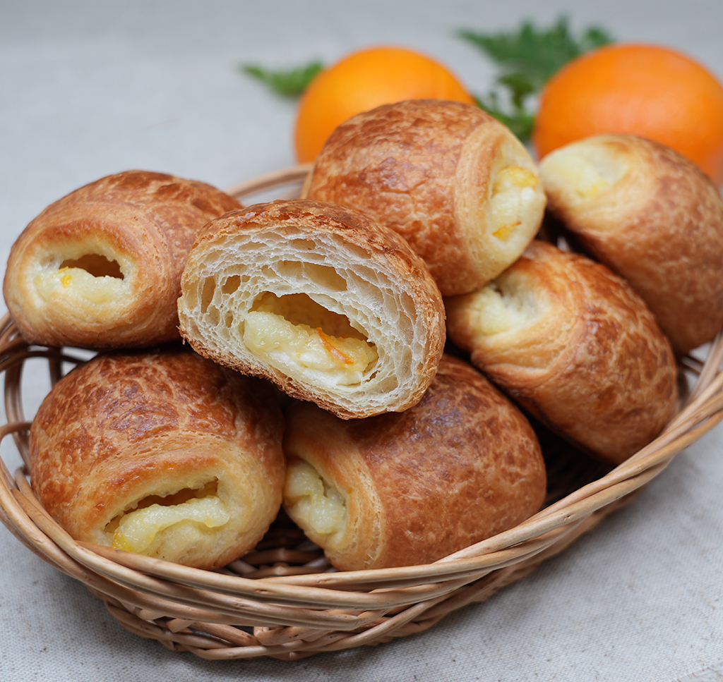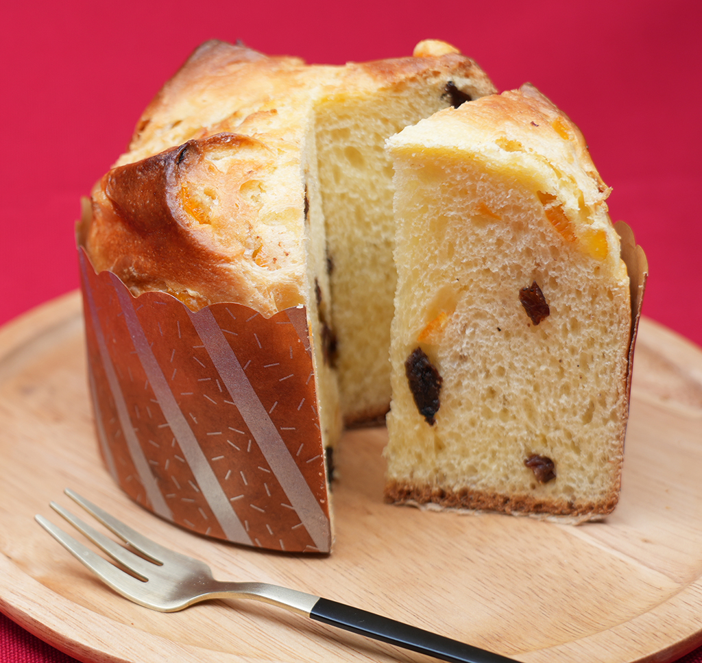 しっとりと口どけの良いブリオッシュ生地にオレンジピールとレーズンを練りこみました。発酵種を配合し、コクのある旨味と上品な甘さが特徴です。